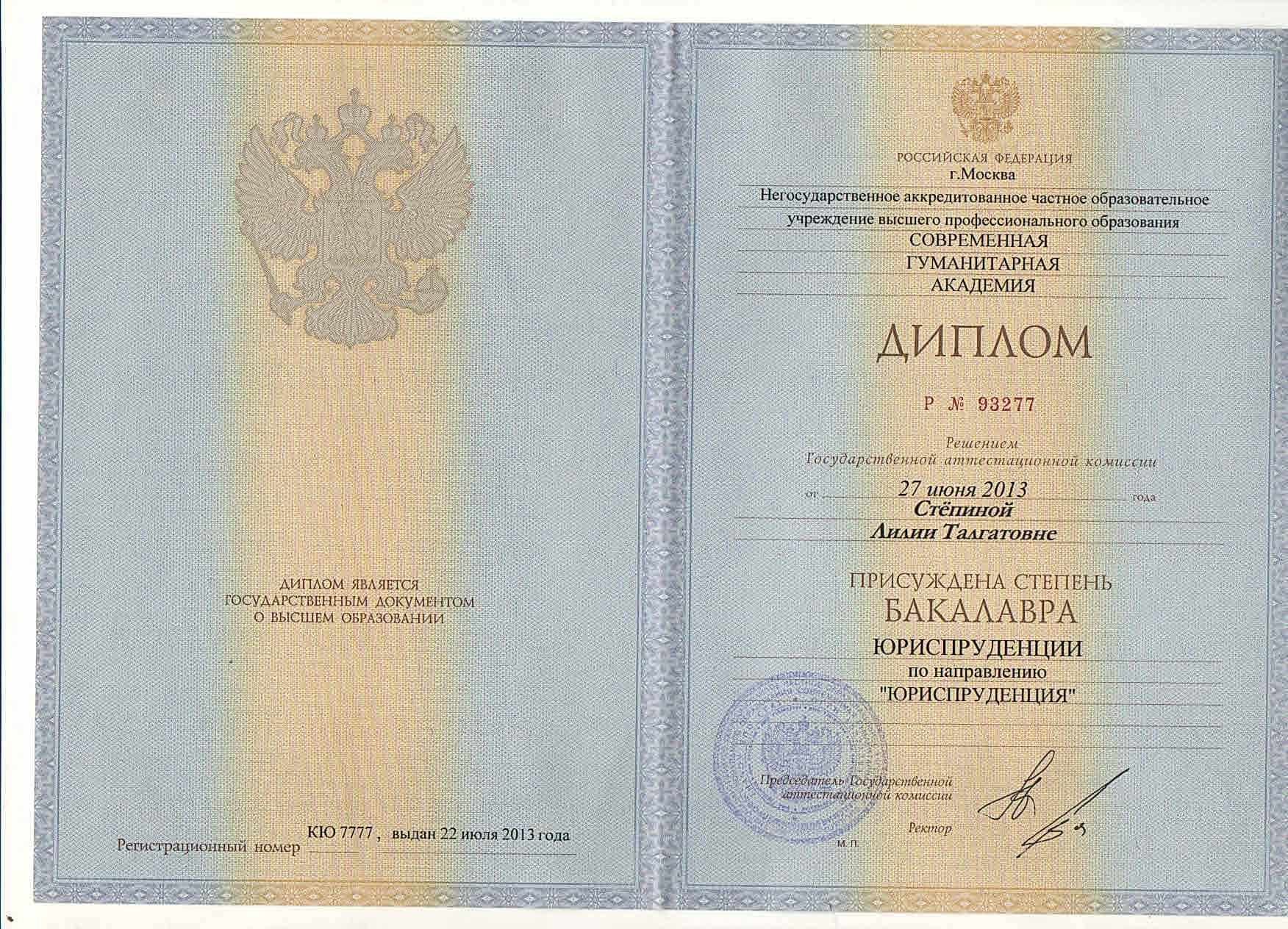 2013 г. - Современная гуманитарная академия, Бакалавр юриспруденции