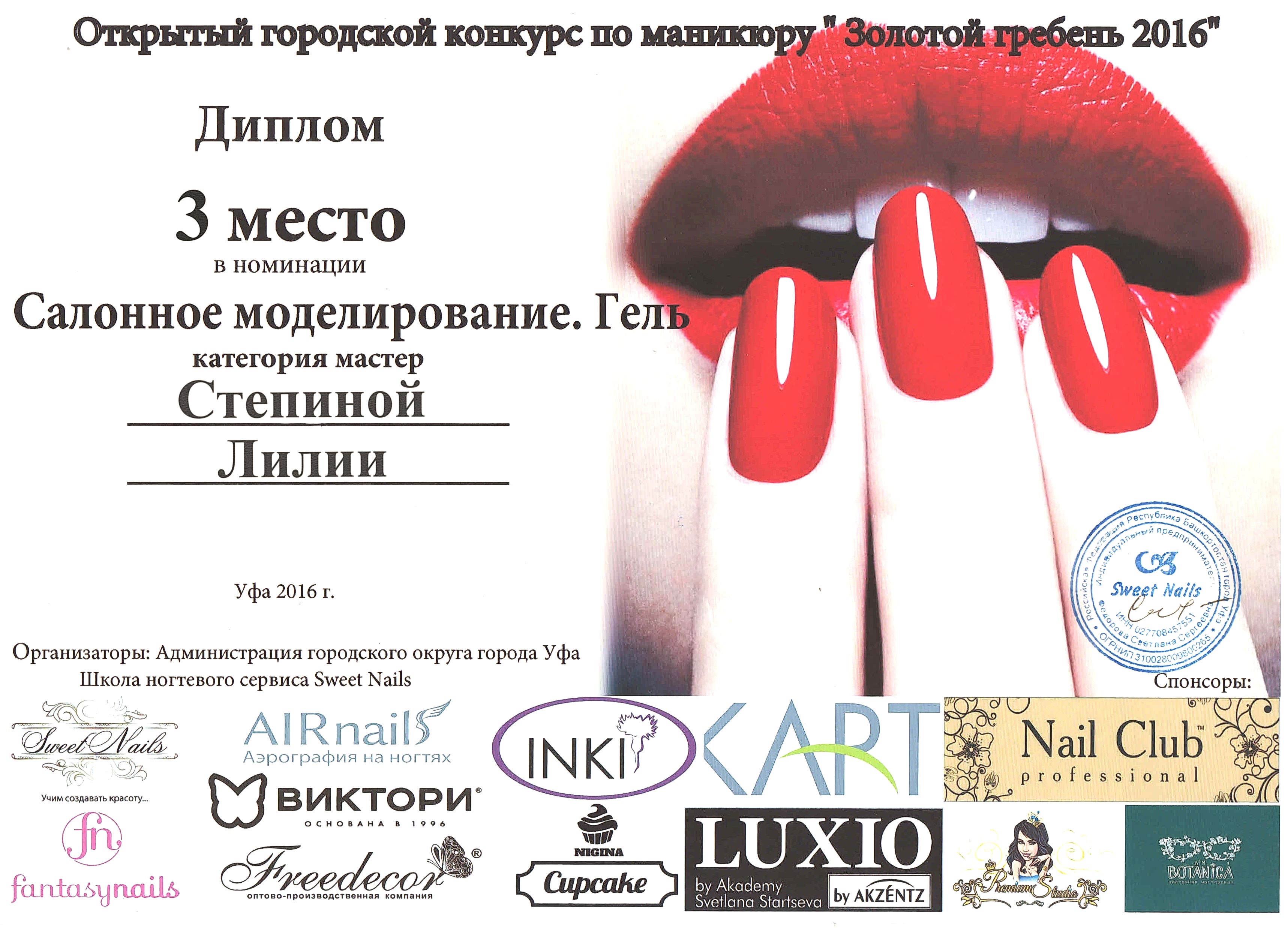 2016 г. - Фестиваль "Золотой гребень", 3-е место в номинации "Салонное моделирование ногтей/гель"