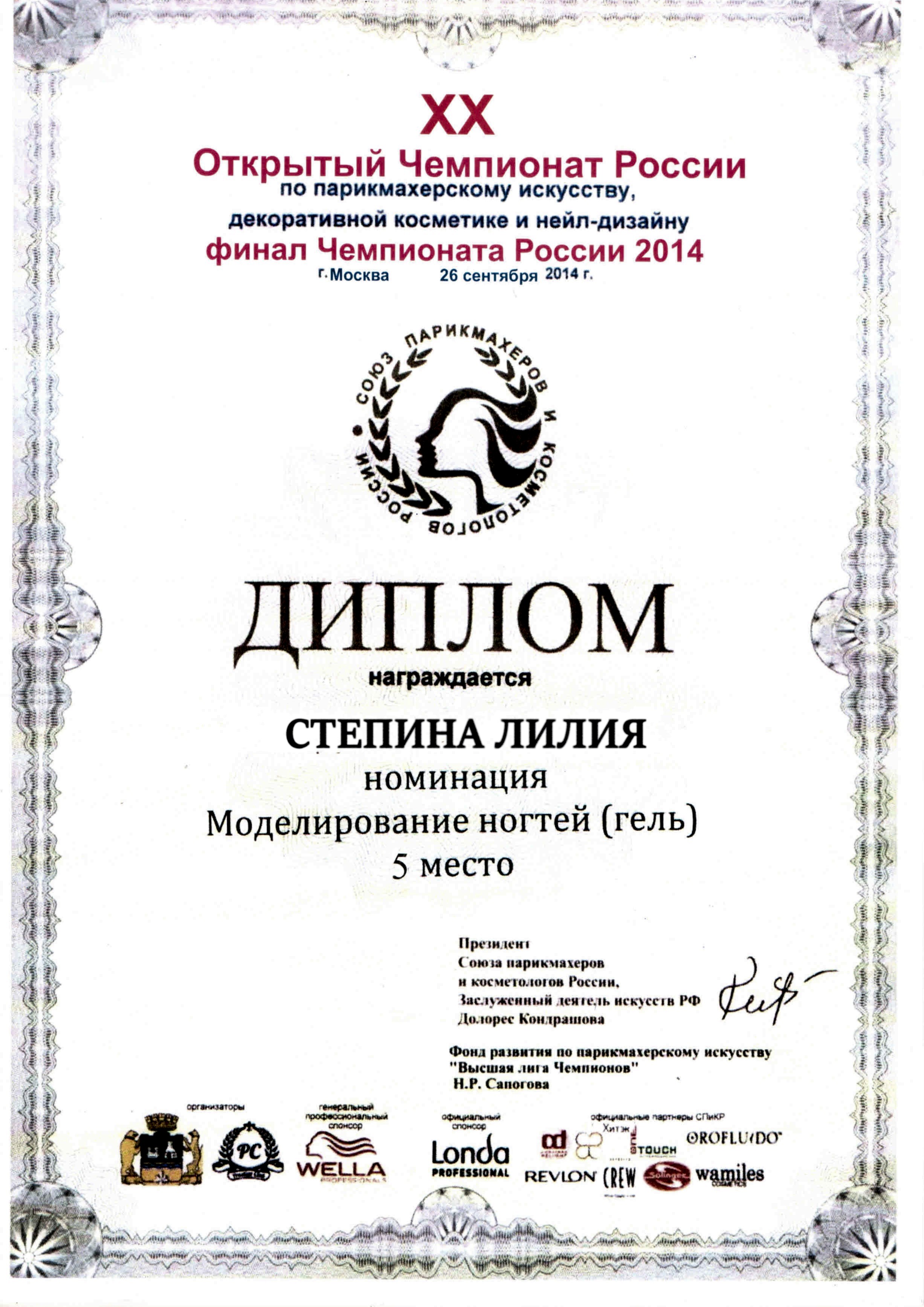 2014 г. - Финал Чемпионата Казахстана, 5-е место в номинации "Моделирование ногтей/гель"