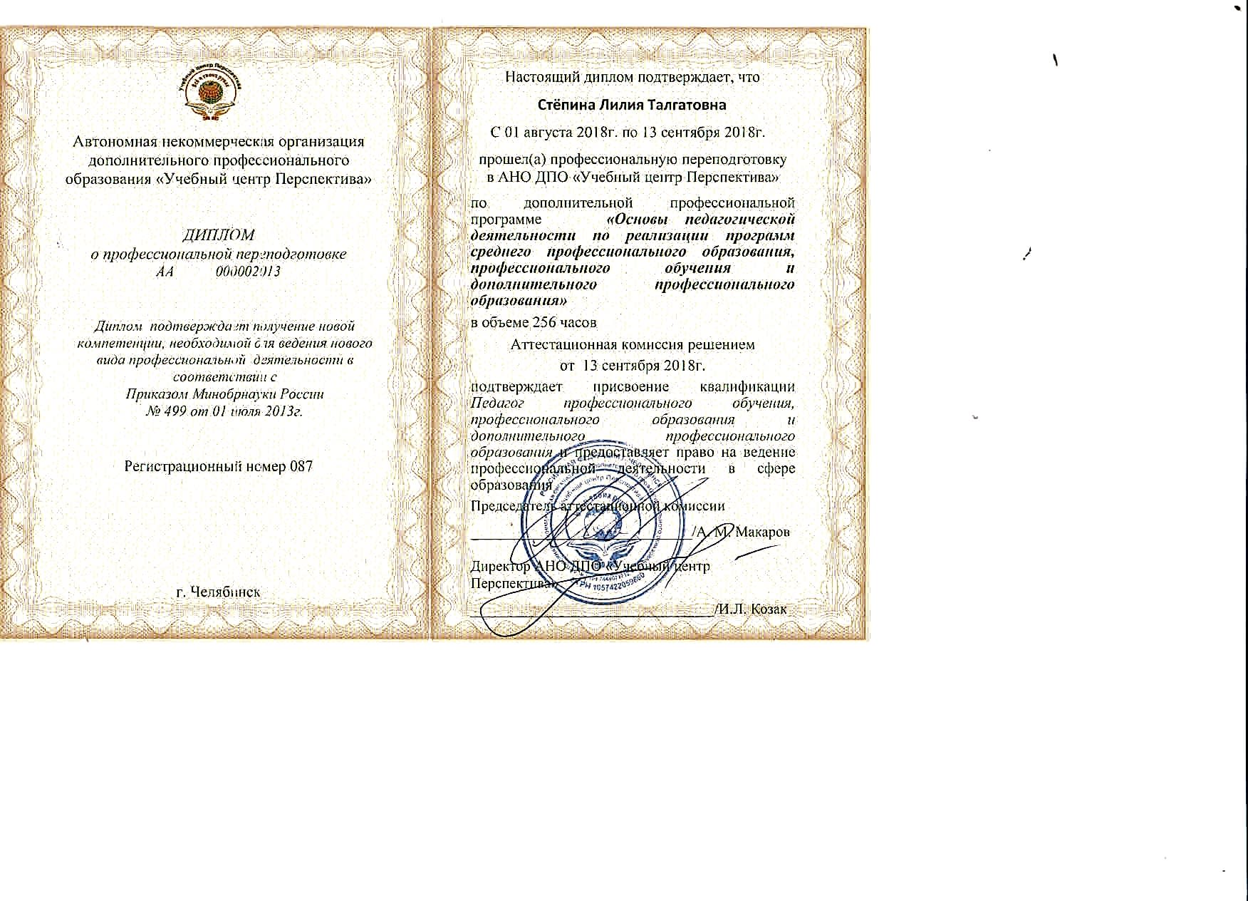 2018 г. - УЦ "Перспектива", дополнительная программа "Педагогическая деятельность по программе среднего профессионального образования"