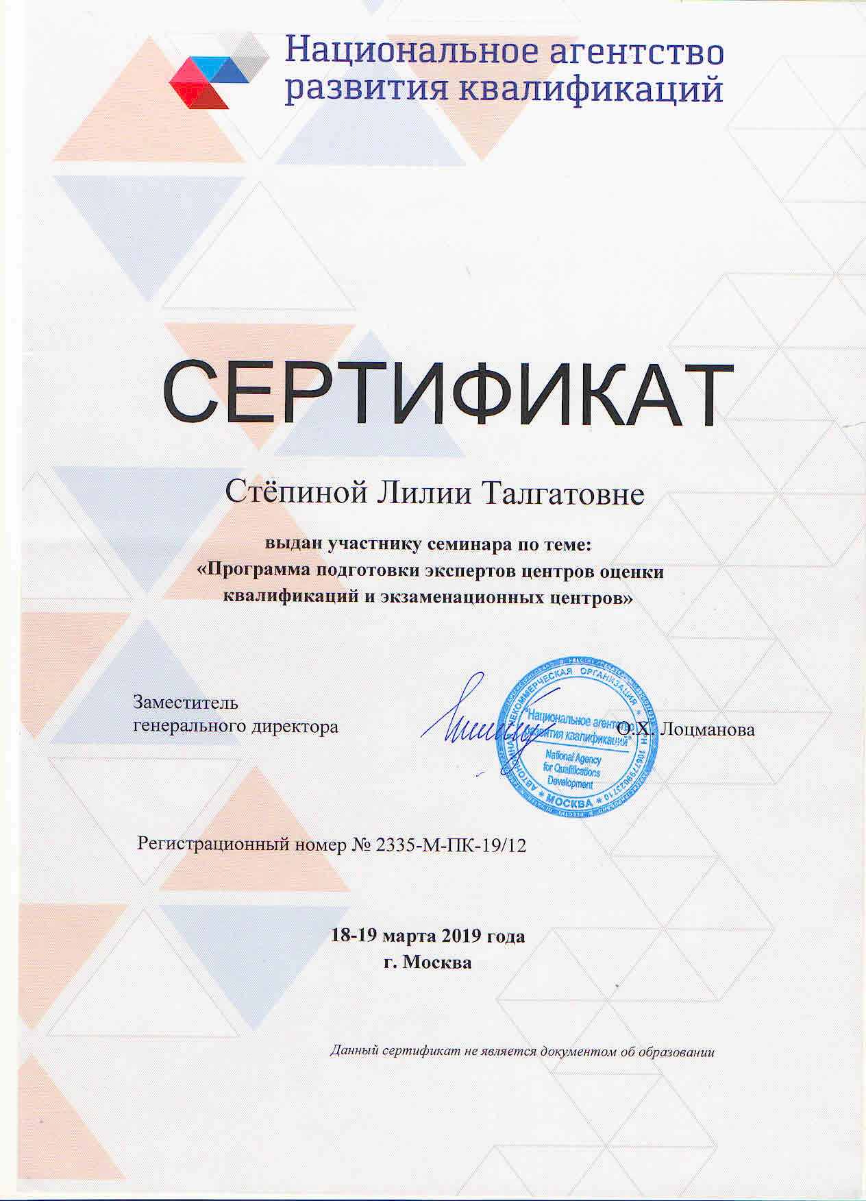 2019 г. - НАРК повышение квалификации"Программа подготовки экспертов центров оценки квалификации"